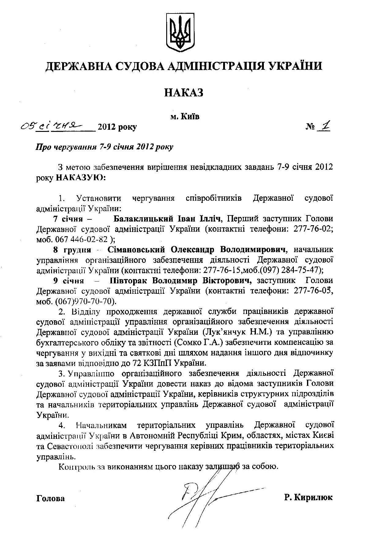 Наказ Державної судової адміністрації України від 5 січня 2012 року № 1 "Про чергування 7 - 9 січня 2012 року"