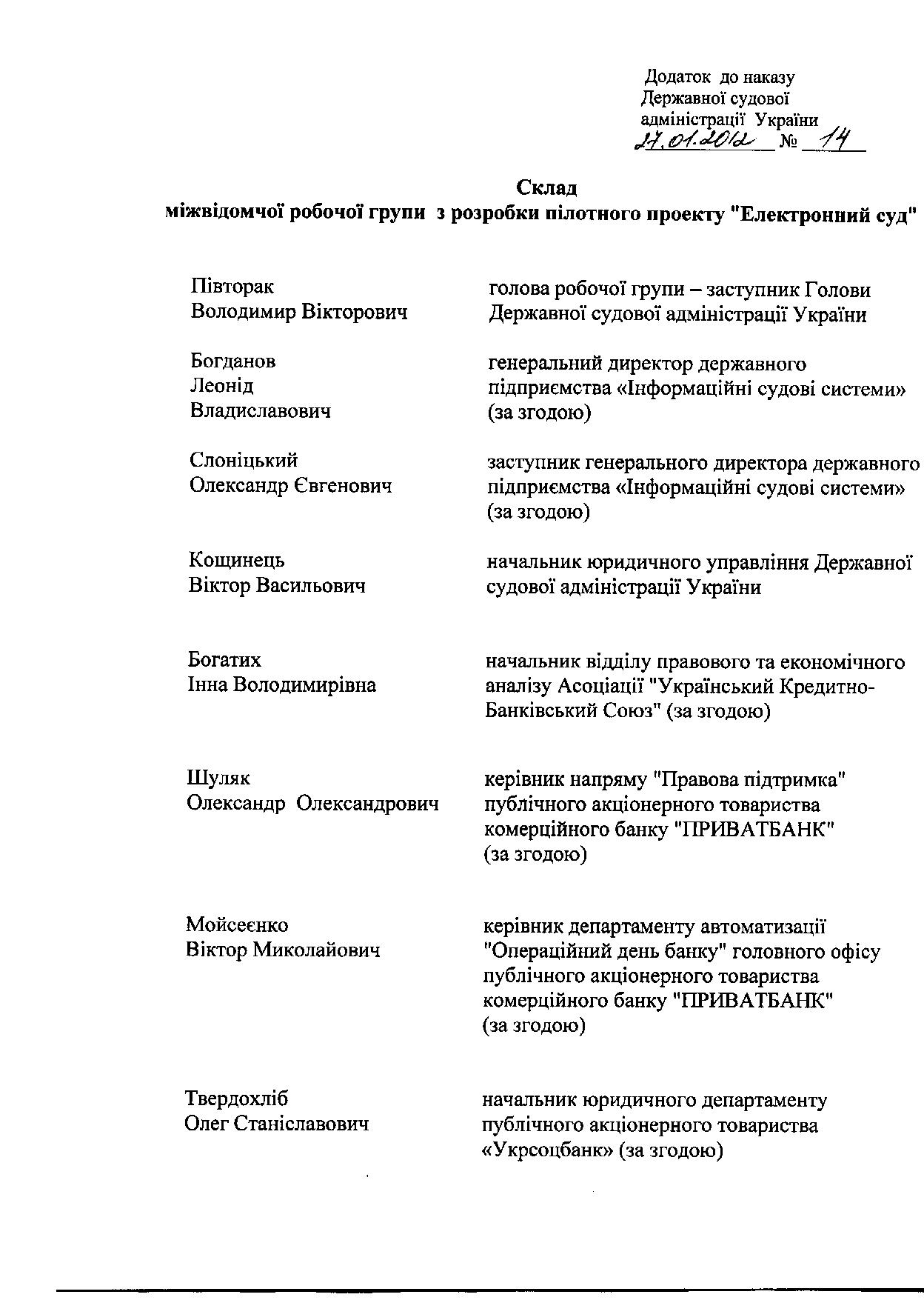 Наказ Державної судової адміністрації України від 27 січня 2012 року № 14 "Про утворення міжвідомчої робочої групи з розробки пілотного проекту "Електронний суд""