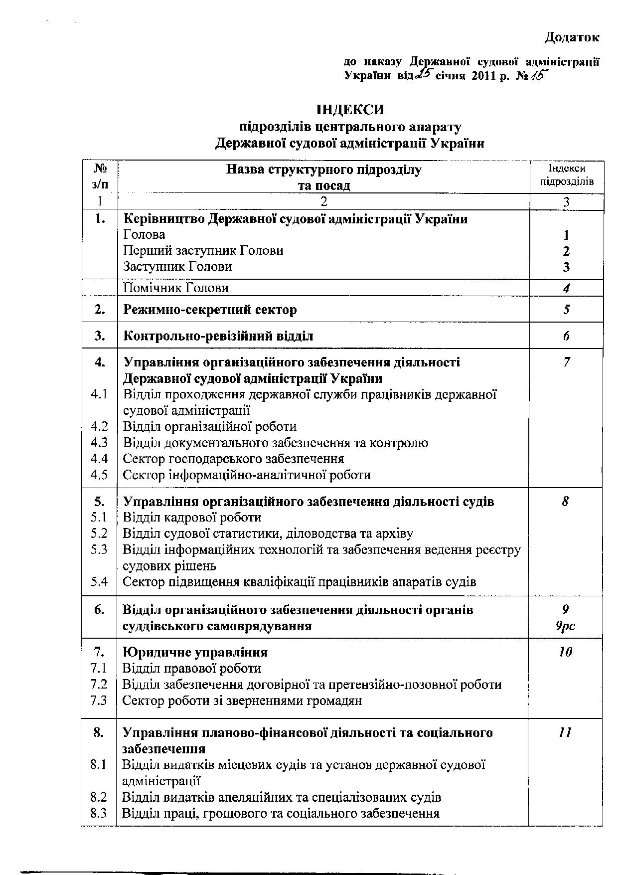 Наказ Державної судової адміністрації України від 25 січня 2011 року № 15 "Про затвердження індексів структурних підрозділів центрального апарату Державної судової адміністрації України"