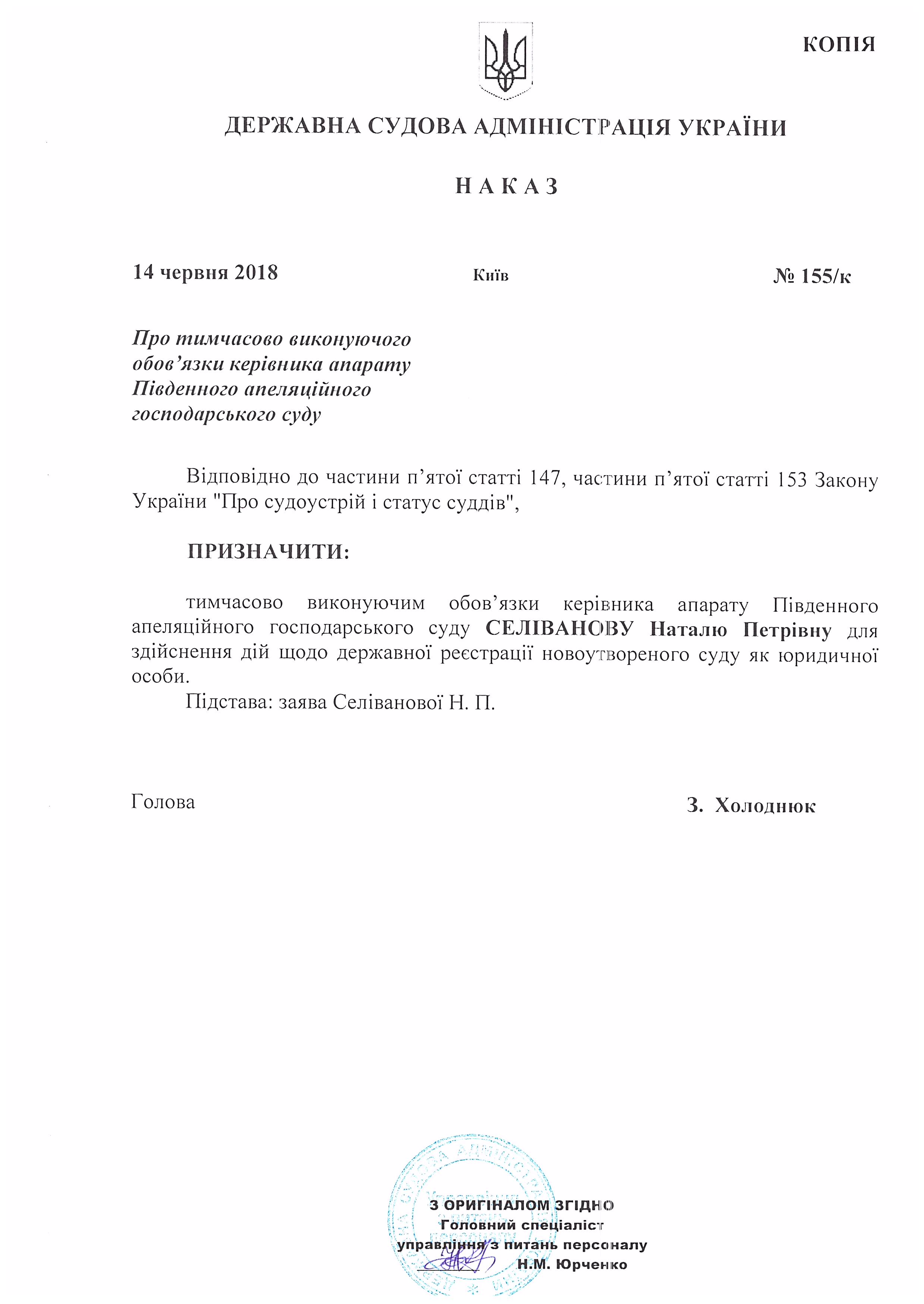 Наказ Державної судової адміністрації України від 14 червня 2018 року №155/к Про тимчасово виконуючого обов'язки керівника апарату Південного апеляційного господарського суду