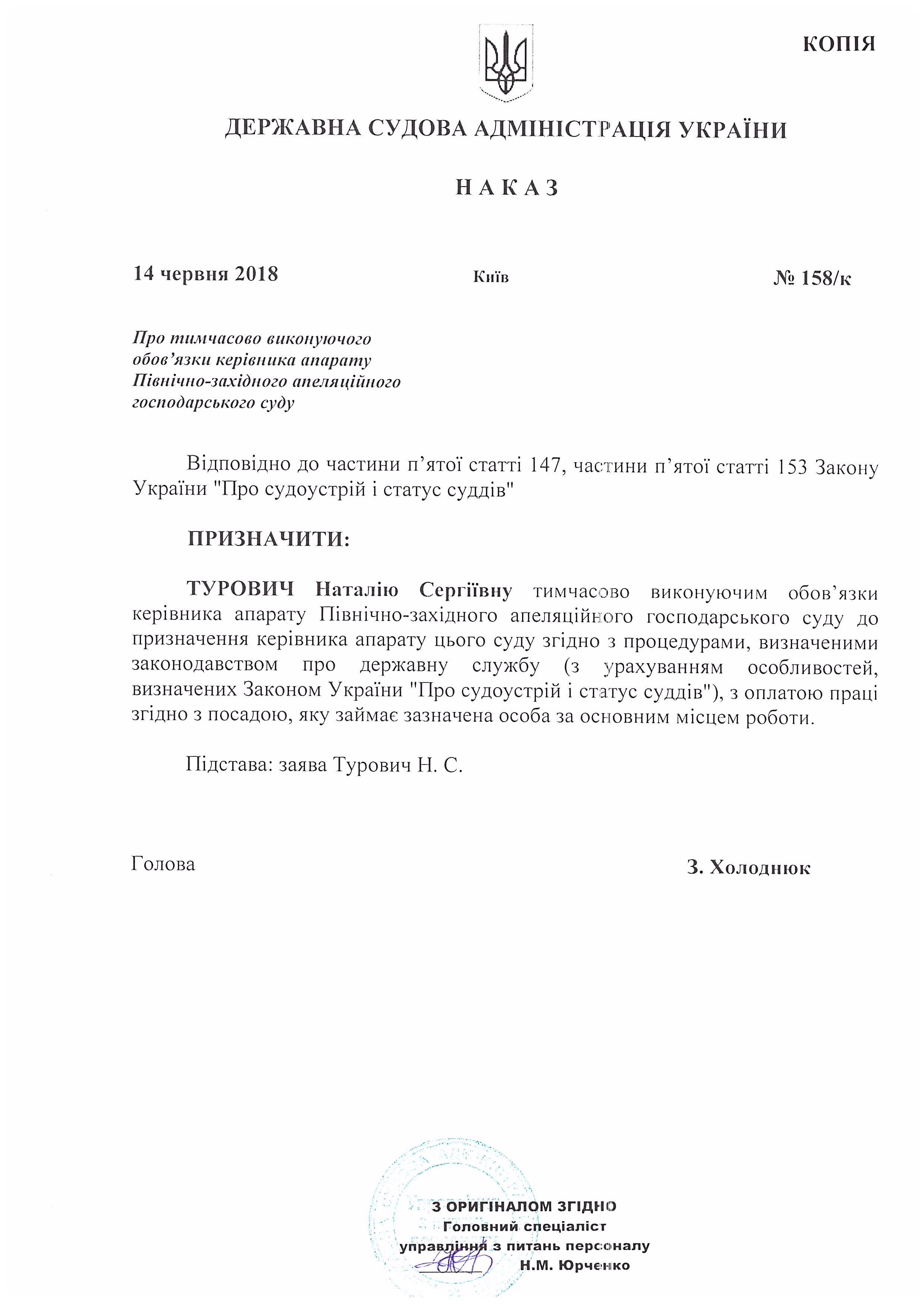 Наказ Державної судової адміністрації України від 14 червня 2018 року №158/к Про тимчасово виконуючого обов'язки керівника апарату Північно-західного апеляційного господарського суду