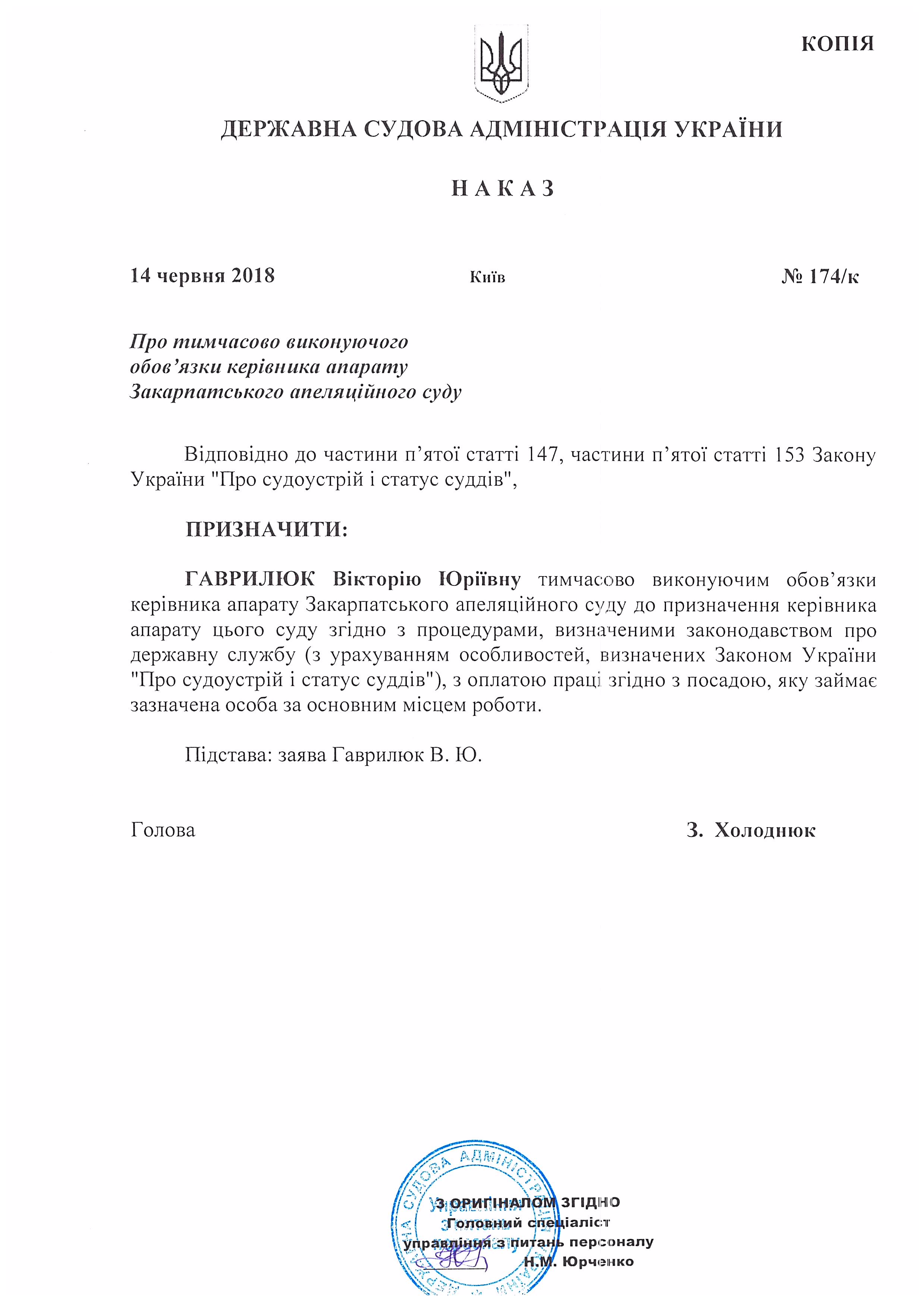 Наказ Державної судової адміністрації України від 14 червня 2018 року №174/к Про тимчасово виконуючого обов'язки керівника апарату Закарпатського апеляційного суду