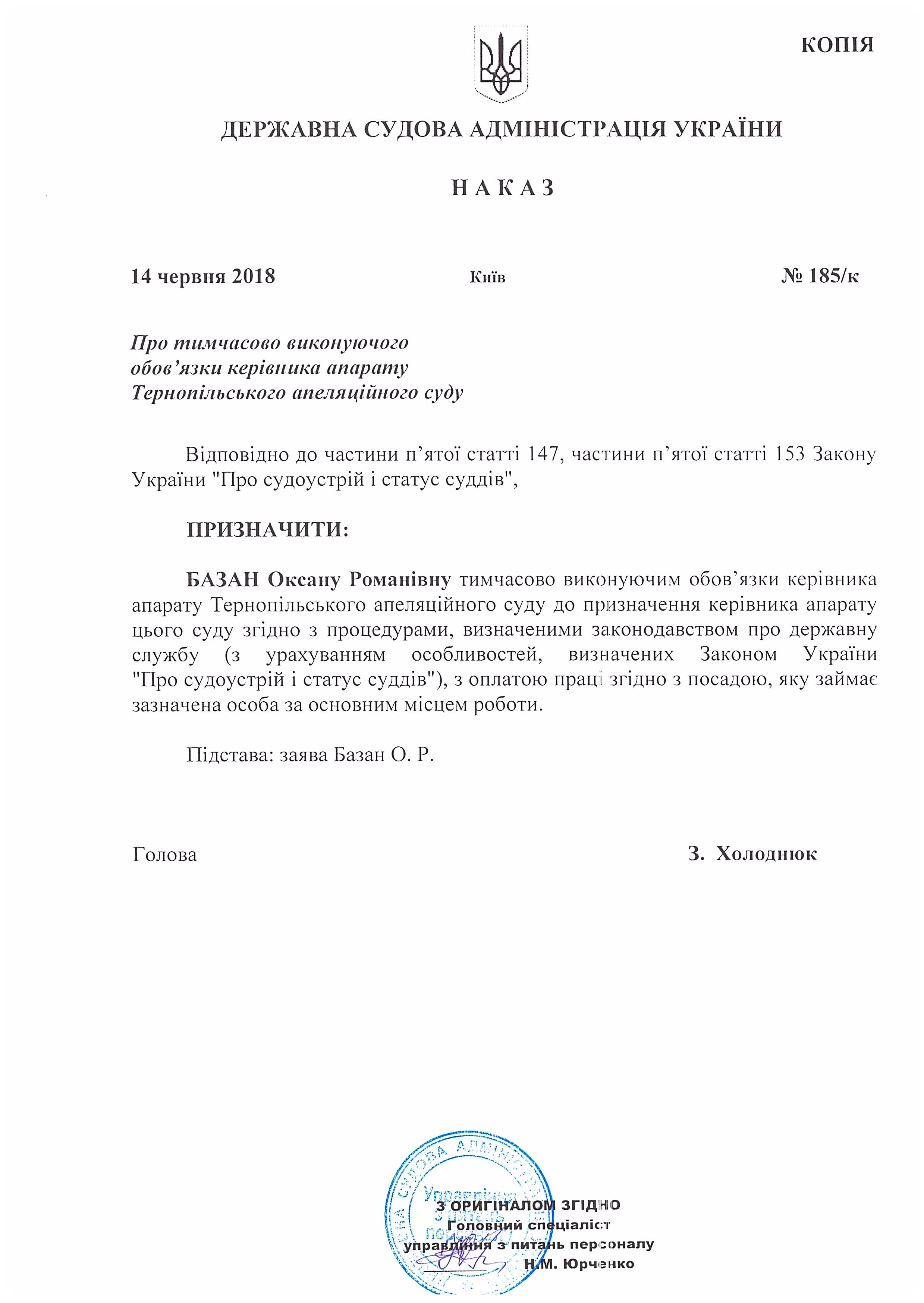 Наказ Державної судової адміністрації України від 14 червня 2018 року №185/к Про тимчасово виконуючого обов'язки керівника апарату Тернопільського апеляційного суду