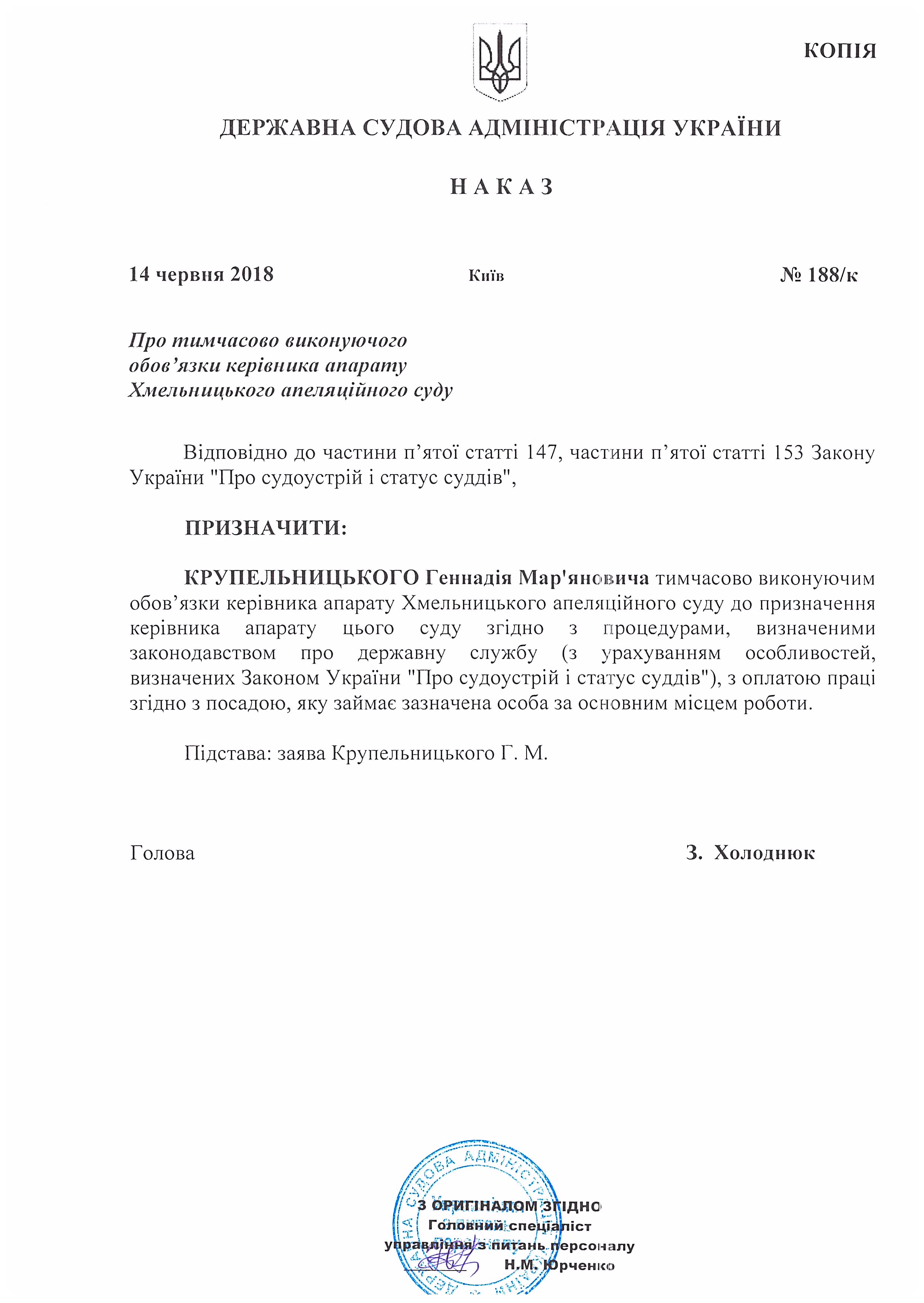 Наказ Державної судової адміністрації України від 14 червня 2018 року №188/к Про тимчасово виконуючого обов'язки керівника апарату Хмельницького апеляційного суду