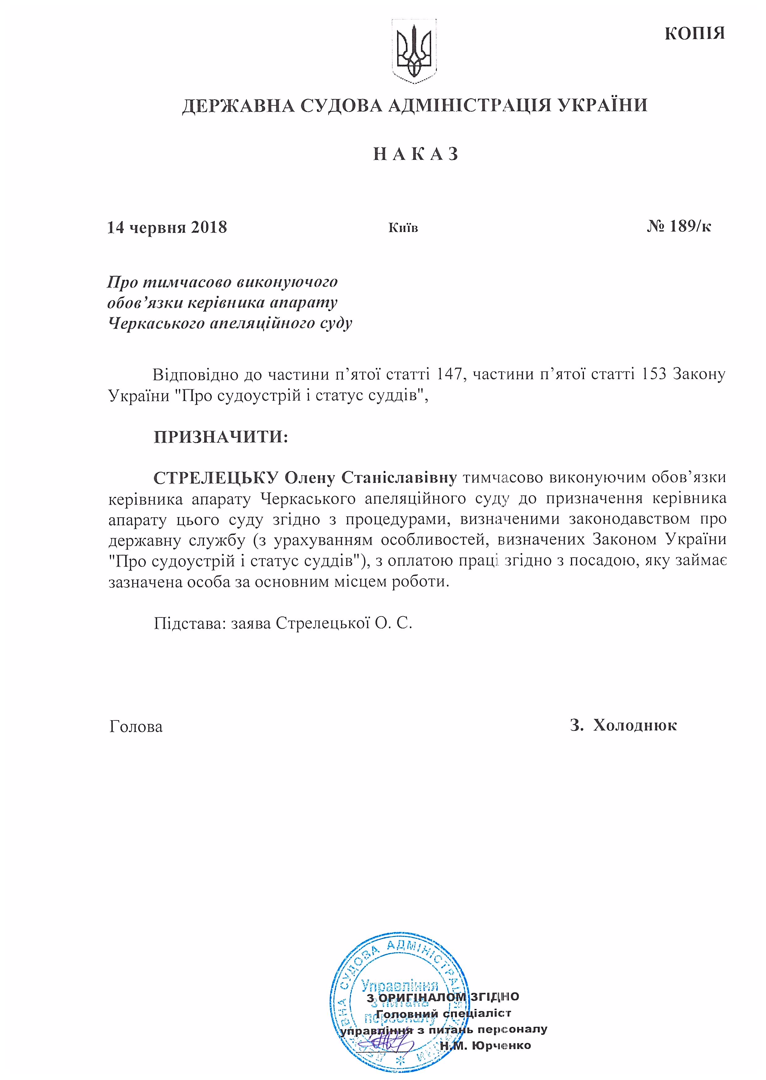 Наказ Державної судової адміністрації України від 14 червня 2018 року №189/к Про тимчасово виконуючого обов'язки керівника апарату Черкаського апеляційного суду