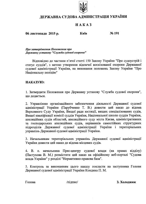 Наказ Державної судової адміністрації України від 06 листопада 2015 року №191 “Про затвердження Положення про Державну установу "Служба судової охорони”