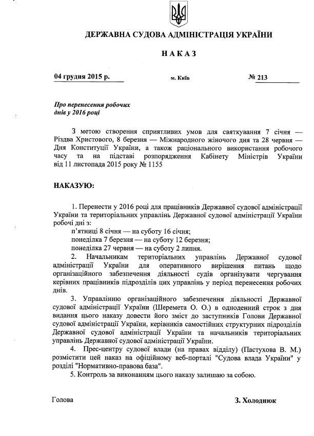 Наказ від 04 грудня 2015 року №213 “Про перенесення робочих днів у 2016 році”