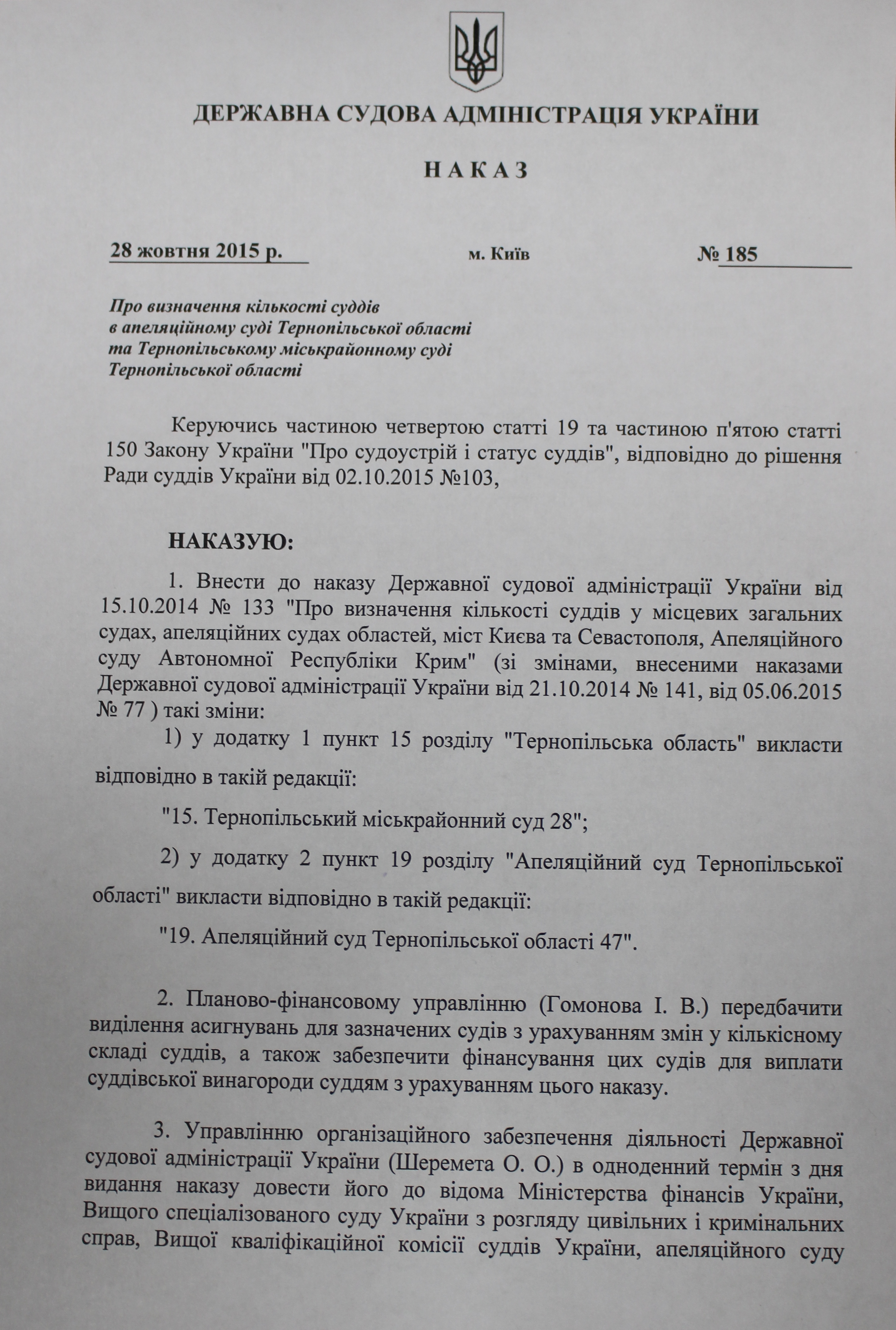 Наказ Державної судової адміністрації України від 28 жовтня 2015 року №185 “Про визначення кількості суддів в апеляційному суді Тернопільської області та Тернопільському міськрайонному суді Тернопільської області”