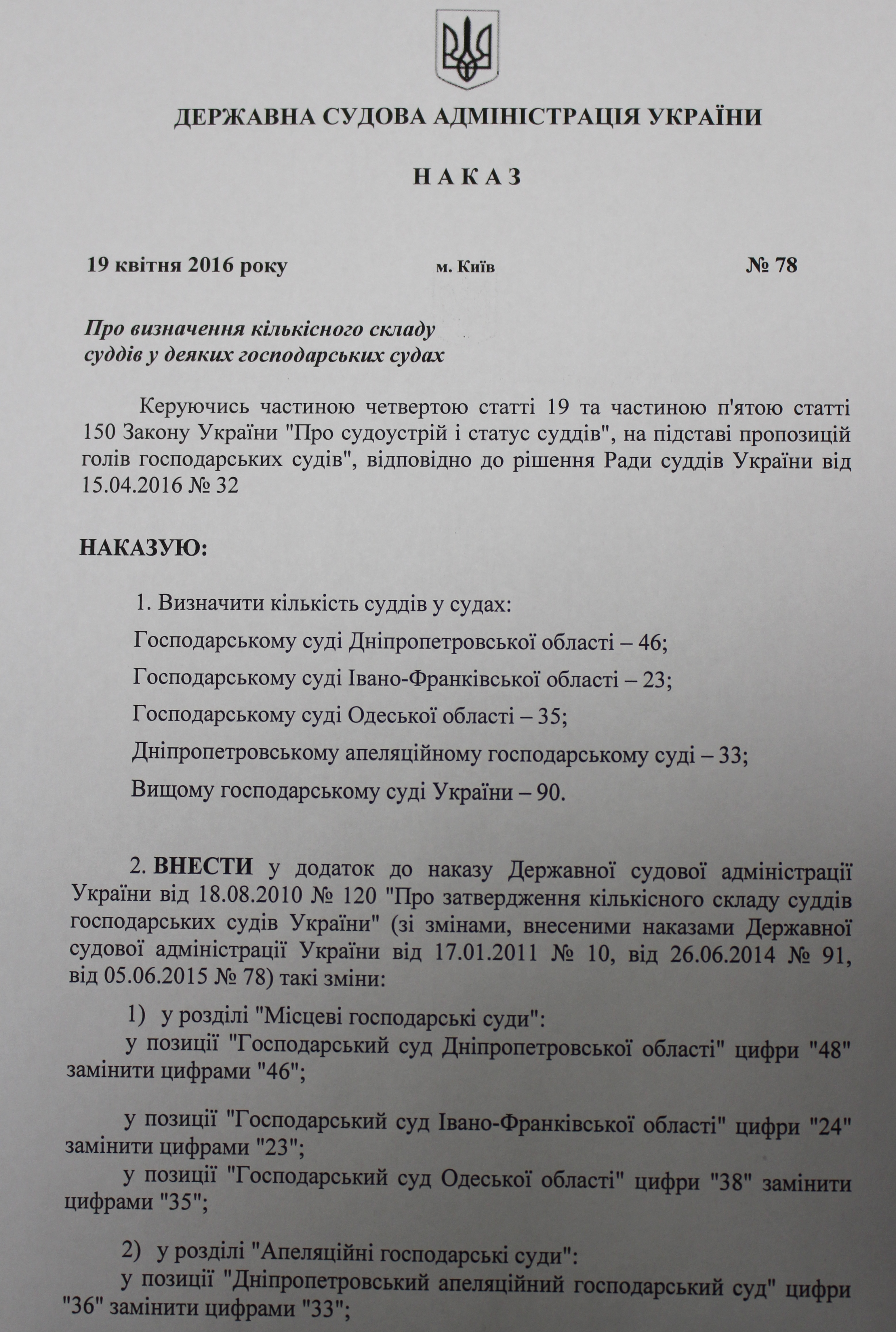 Наказ Державної судової адміністрації України від 19.04.2016 року №78 “Про визначення кількісного складу суддів у деяких господарських судах”
