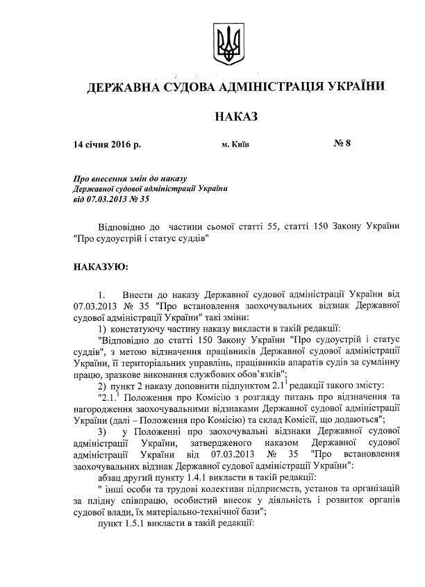 Наказ від 14 січня 2016 року №8 “Про внесення змін до наказу Державної судової Адміністрації України від 07.03.2013 №35”