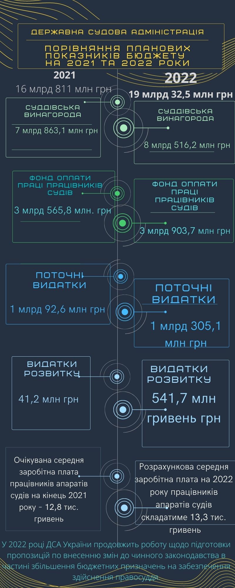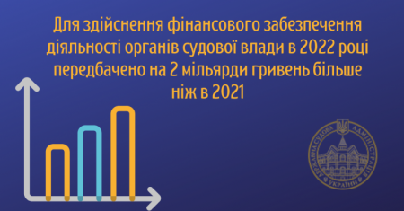 У 2022 році Законом України ″Про Державний бюджет України на 2022 рік″ для здійснення організаційного та фінансового забезпечення діяльності органів судової влади передбачено 19 млрд 32,5 млн грн, що в порівнянні з 2021 роком більше на 2 млрд 221,5 млн гривень.