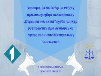 24 червня 2021 року, о 19:30 суддя-спікер Господарського суду Одеської області Юлія Щавинська візьме участь у прямому ефірі Одеського телеканалу „Перший міський” на тему: „Авторське право та інтелектуальна власність”.