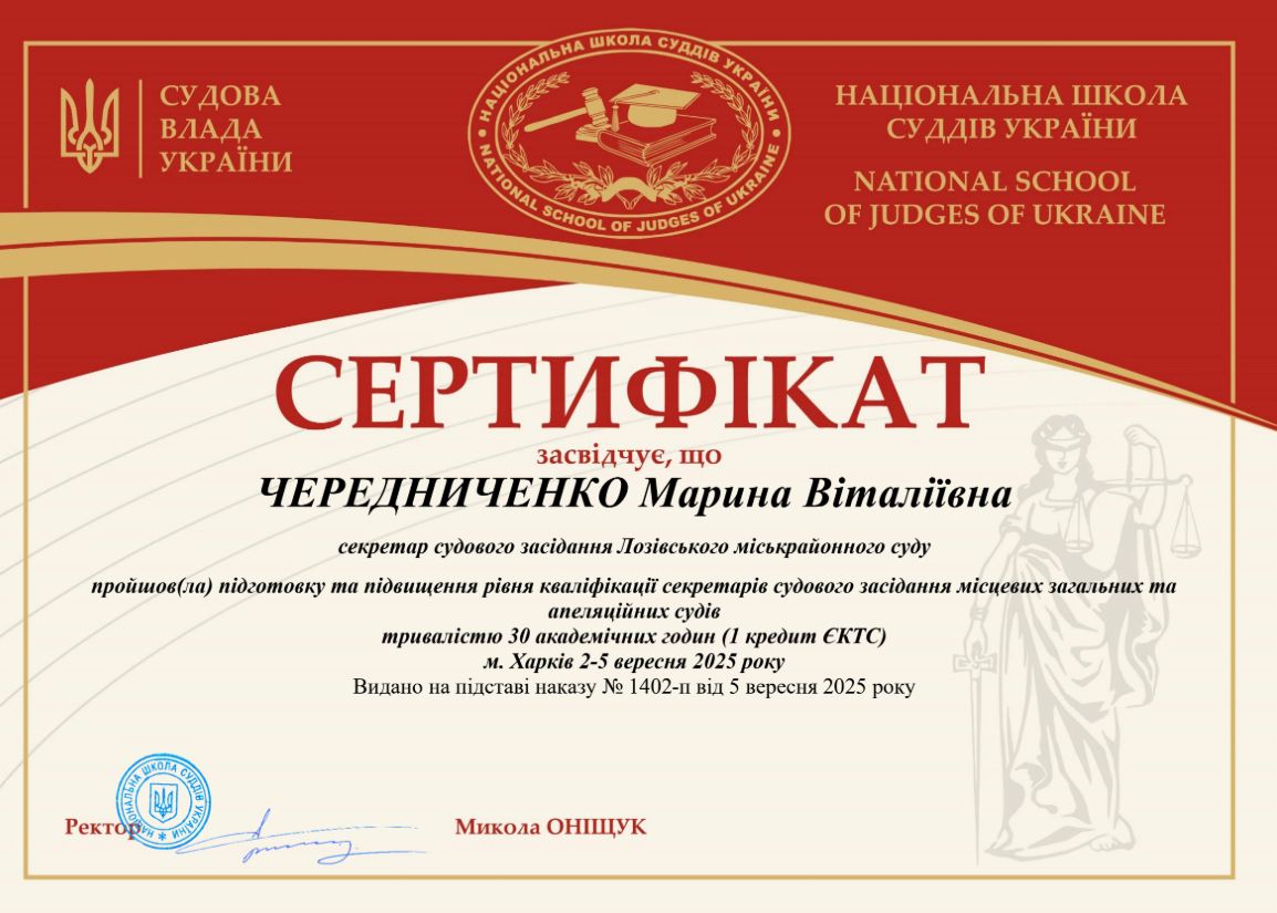 Чередниченко Марина, секретар судового засідання Лозівського міськрайонного суду Харківської області, з 2-5 вересня 2025 року пройшла підготовку та підвищення рівня кваліфікайції секретарів судового засідання місцевихх загальних та апеляційних судів.